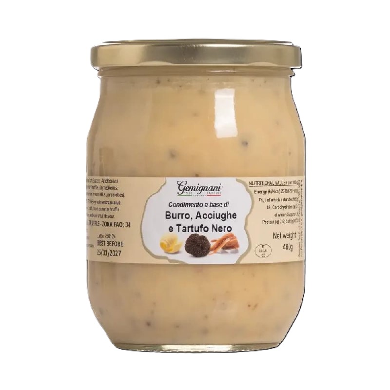 Συστατικά: Βούτυρο 87% (παστεριωμένη κρέμα γάλακτος, προβιοτικά), αντζούγιες 7% (ψάρι – Engraulis encrasicolus, ηλιέλαιο, αλάτι), μαύρη καλοκαιρινή τρούφα Ιταλικής προελεύσεως 5% (Tuber aestivum Vitt.), γεύση